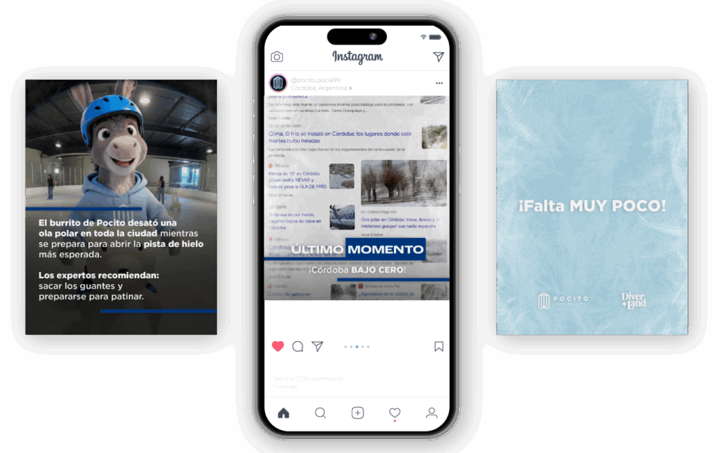 Construimos un concepto claro: invierno urbano en plena ciudad. Desarrollamos una campaña creativa 360° con una estética acorde al tono del cliente y contenidos multiformato, incorporando imágenes y videos generados con IA para darle atmósfera invernal a Pocito. Además, creamos un personaje principal que le da vida al proyecto: el burrito cordobés.