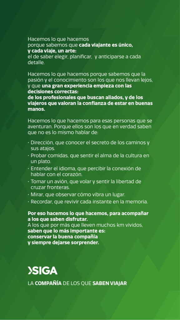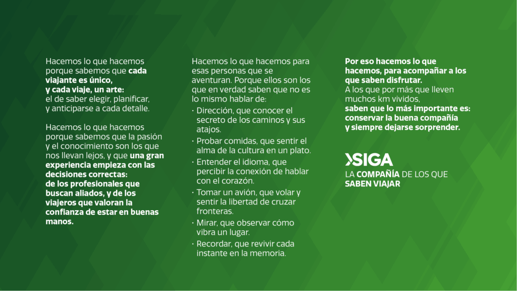 SIGA necesitaba consolidar su marca institucional y ordenar su sistema marcario para dos unidades (mayorista e incoming), diferenciarse en un mercado saturado y profesionalizar su comunicación. El objetivo: reposicionar con claridad, coherencia visual y mensajes consistentes en web y redes, capitalizando sus 16 años, alcance regional y cultura centrada en las personas.